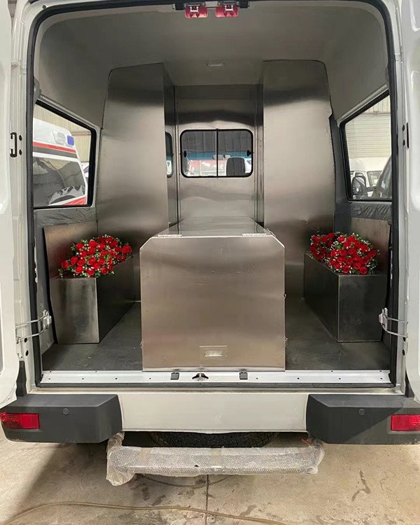 產(chǎn)品簡介 | 1. 主要配置:空調(diào),暖風(fēng),前電動車窗,安全氣囊,ABS,遙控鑰匙 2. 改裝部分采用304L不銹鋼制作,中間不銹鋼隔墻安裝拉窗,不銹鋼地板,不銹鋼常溫棺不銹鋼擔(dān)架,加兩側(cè)玻璃下不銹鋼裝飾 |